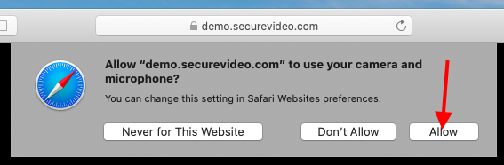 Arrow pointing at "Allow" button for Chrome prompt to use microphone and camera