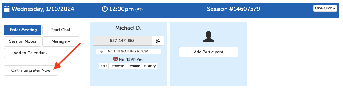 If the Live Interpretation feature is enabled for your account, you will see a button labeled "Call Interpreter Now" on all sessions.