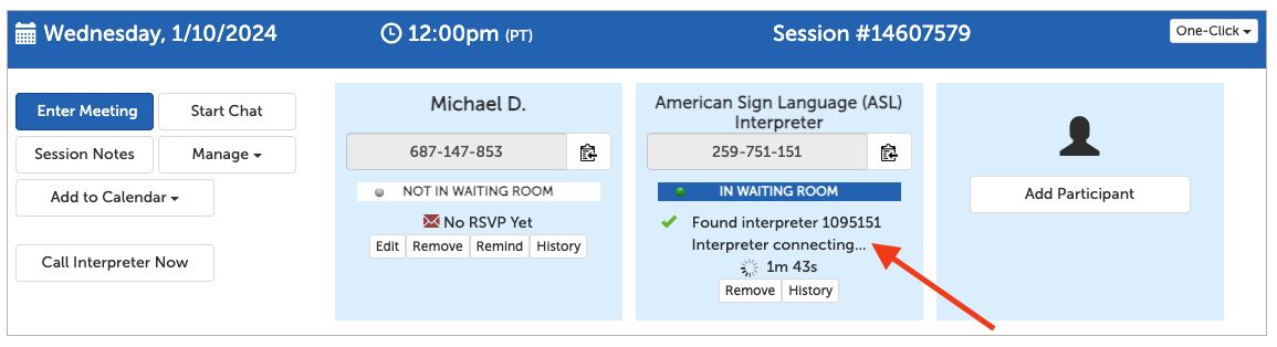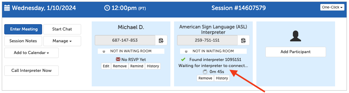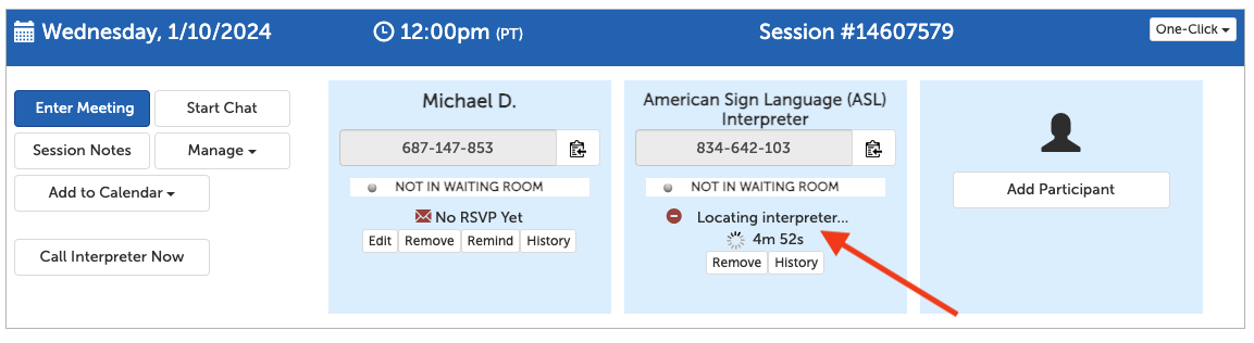 3. Upon confirming the selected language, a new participant panel is added for that interpreter and a countdown timer begins. The duration of the timer depends on the language selected, however it should take no longer than 5 minutes to receive a response. (The average estimated wait time is less than 30 seconds.)